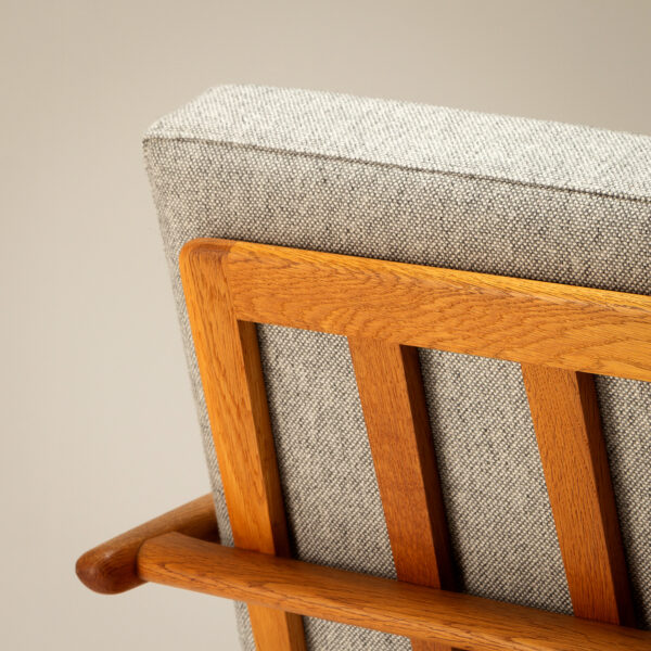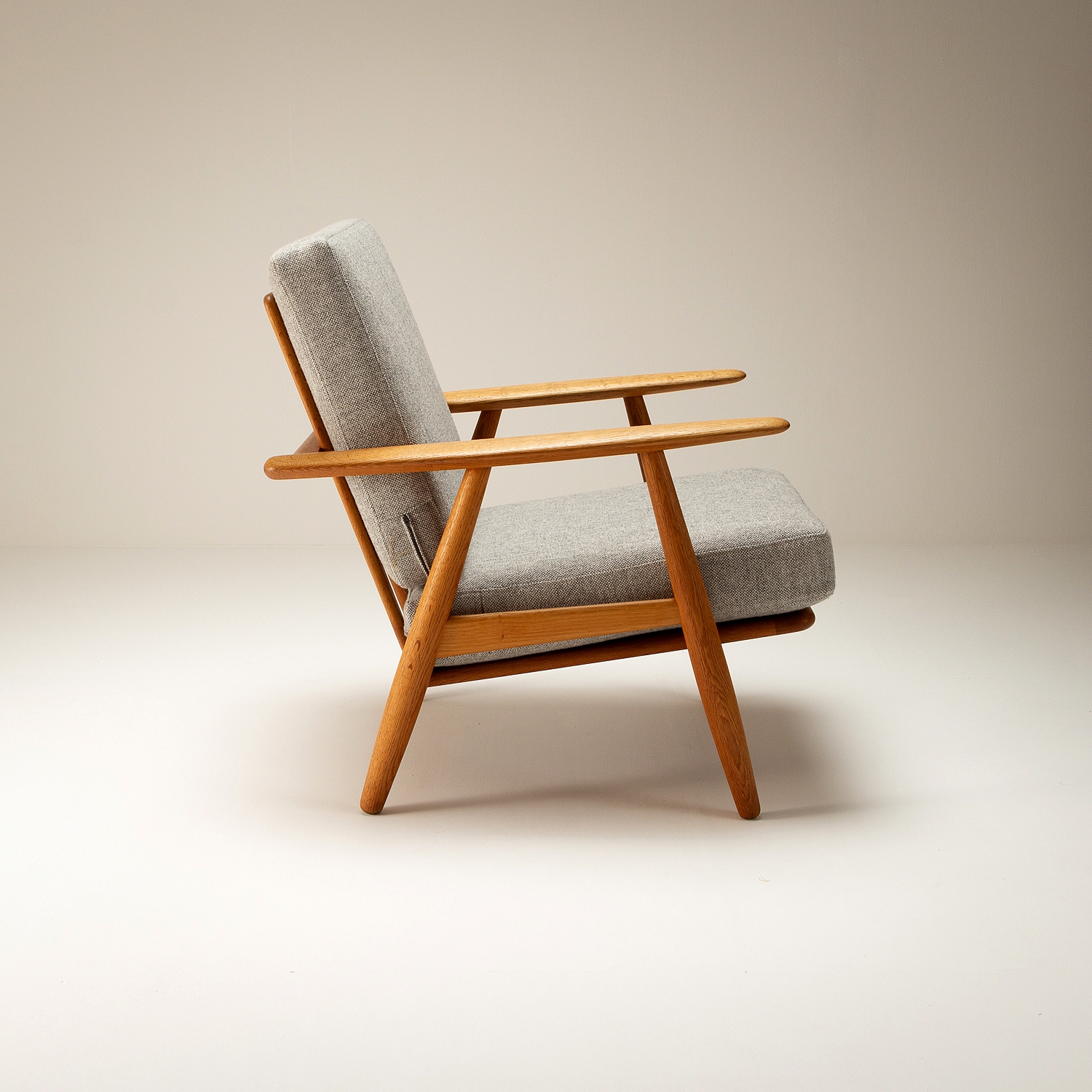 Cigar lounge chair in solid oak. Model GE240, designed by Hans Wegner for Getama, Denmark, 1950s. New cushions reupholstered in Hallingdal. Excellent condition. Retailed through Illums Bolighus in Copenhagen.