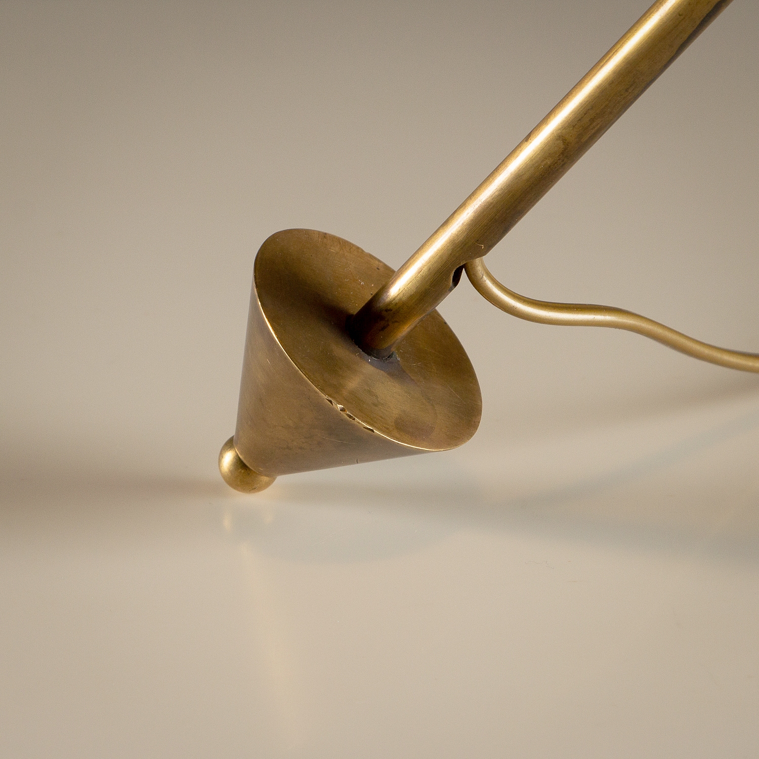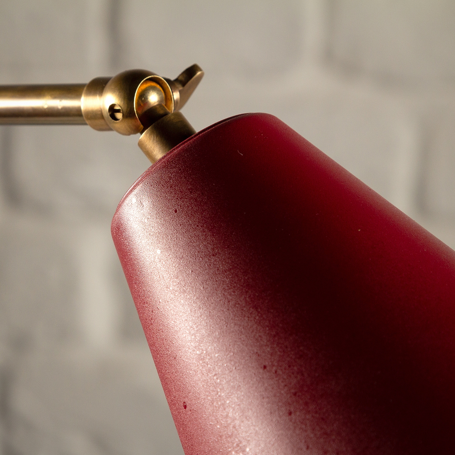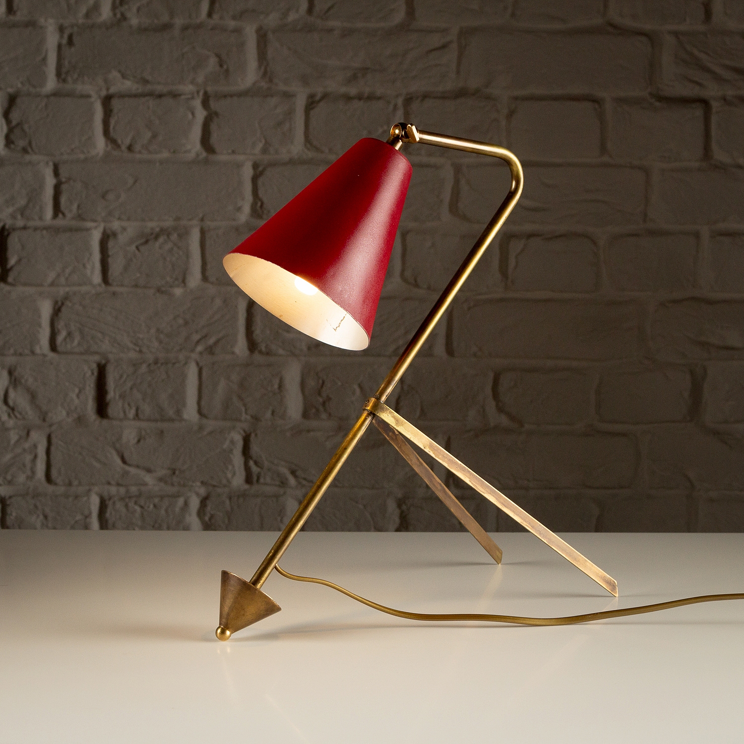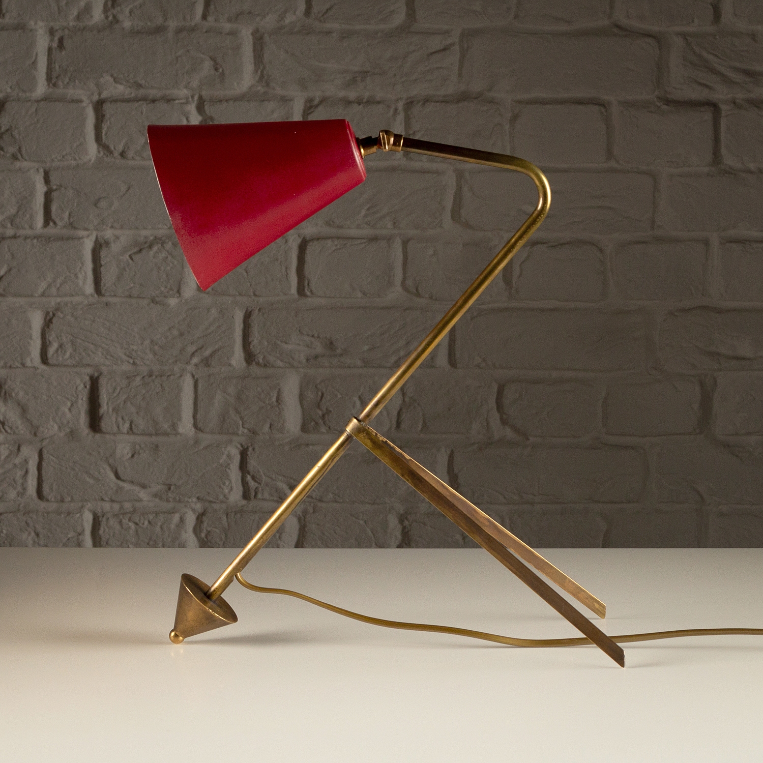 A very unusual desk light in brass with red lacquered shade and distinctive solid brass cone foot. Adjustable shade angle. Sweden, 1950s.