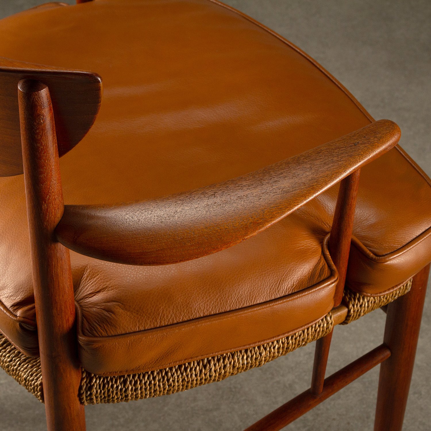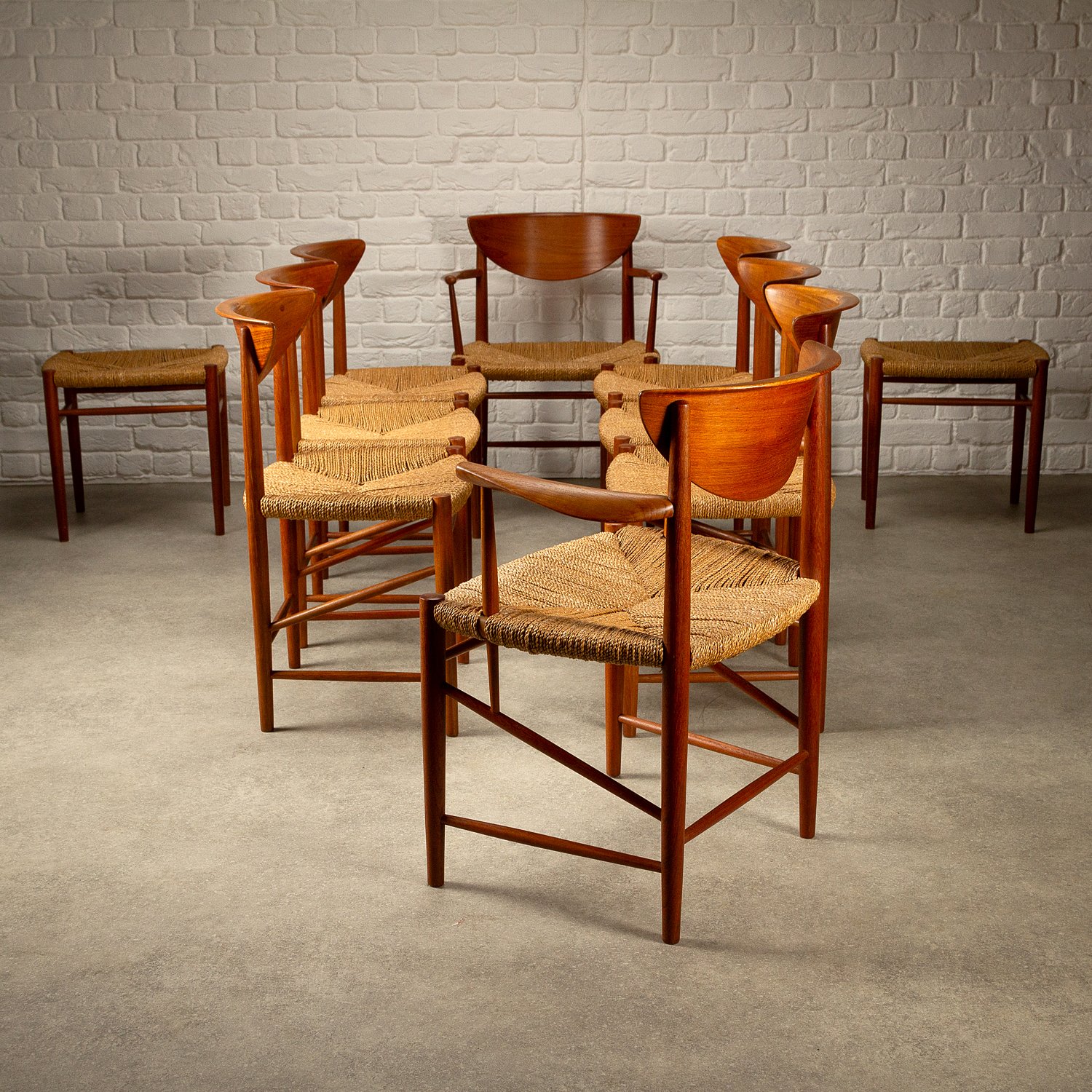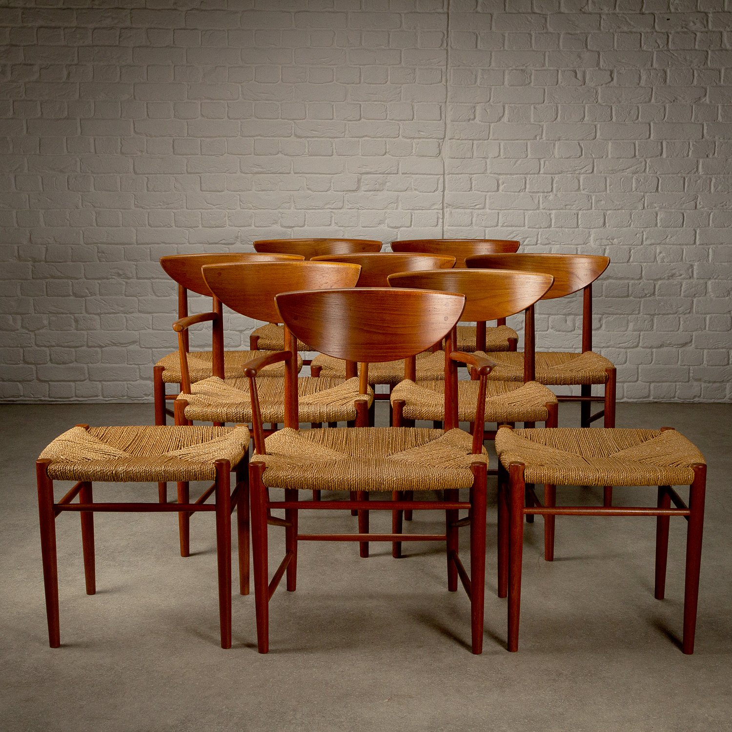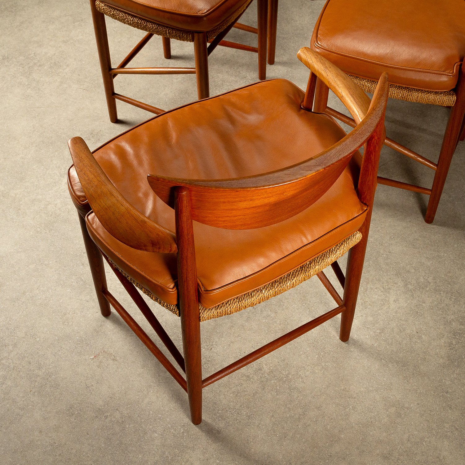 A set of ten dining chairs designed by Peter Hvidt and Orla Mølgaard-Nielsen for Søborg Møbelfabrik, Denmark, 1950s. Comprising of two Model 317 armchairs, six Model 316 chairs and two stools. Solid teak frames with seagrass seats. Includes bespoke-made cushions in cognac aniline leather. All original with lovely patina and signs of age. Professional repair to the back of one chair. See photographs.