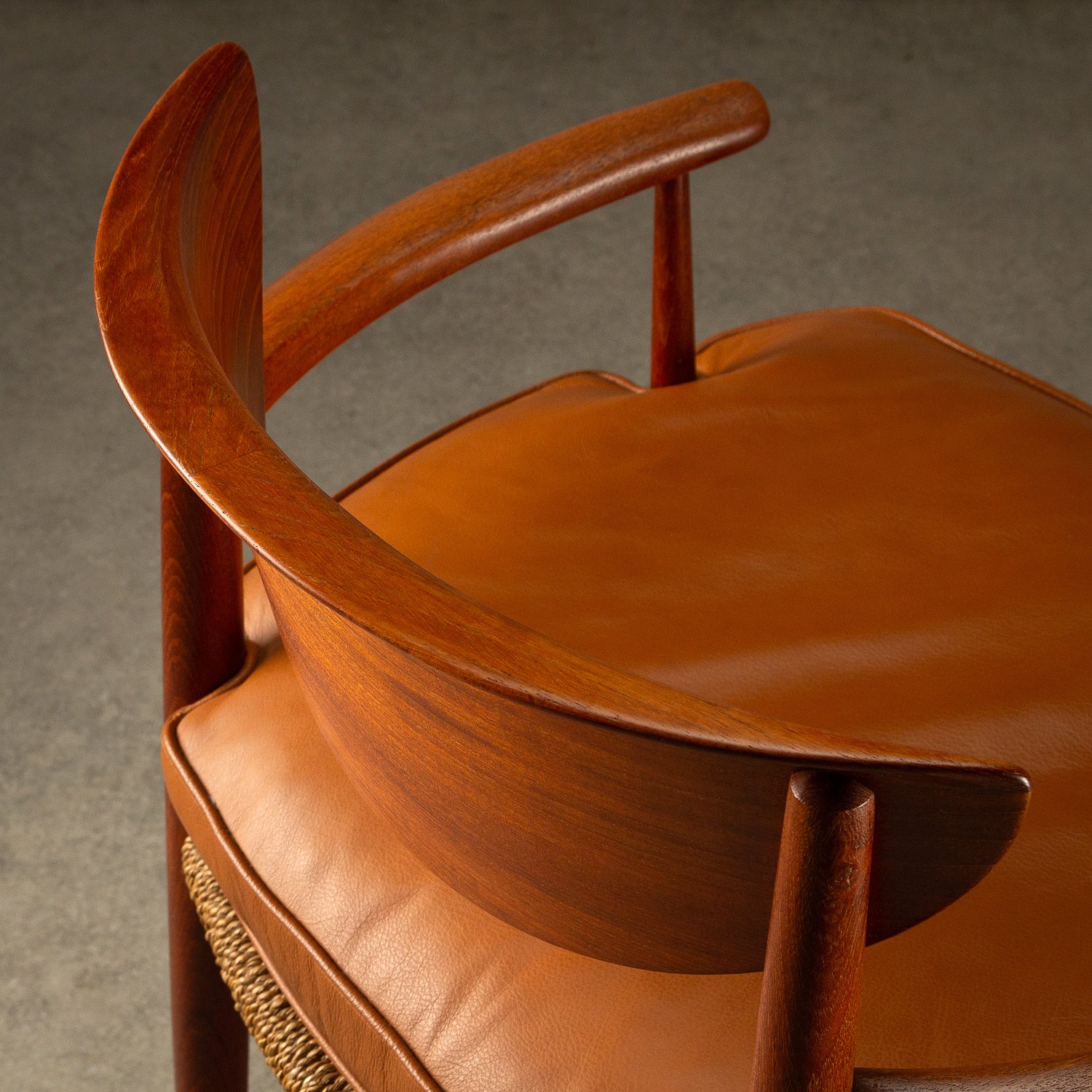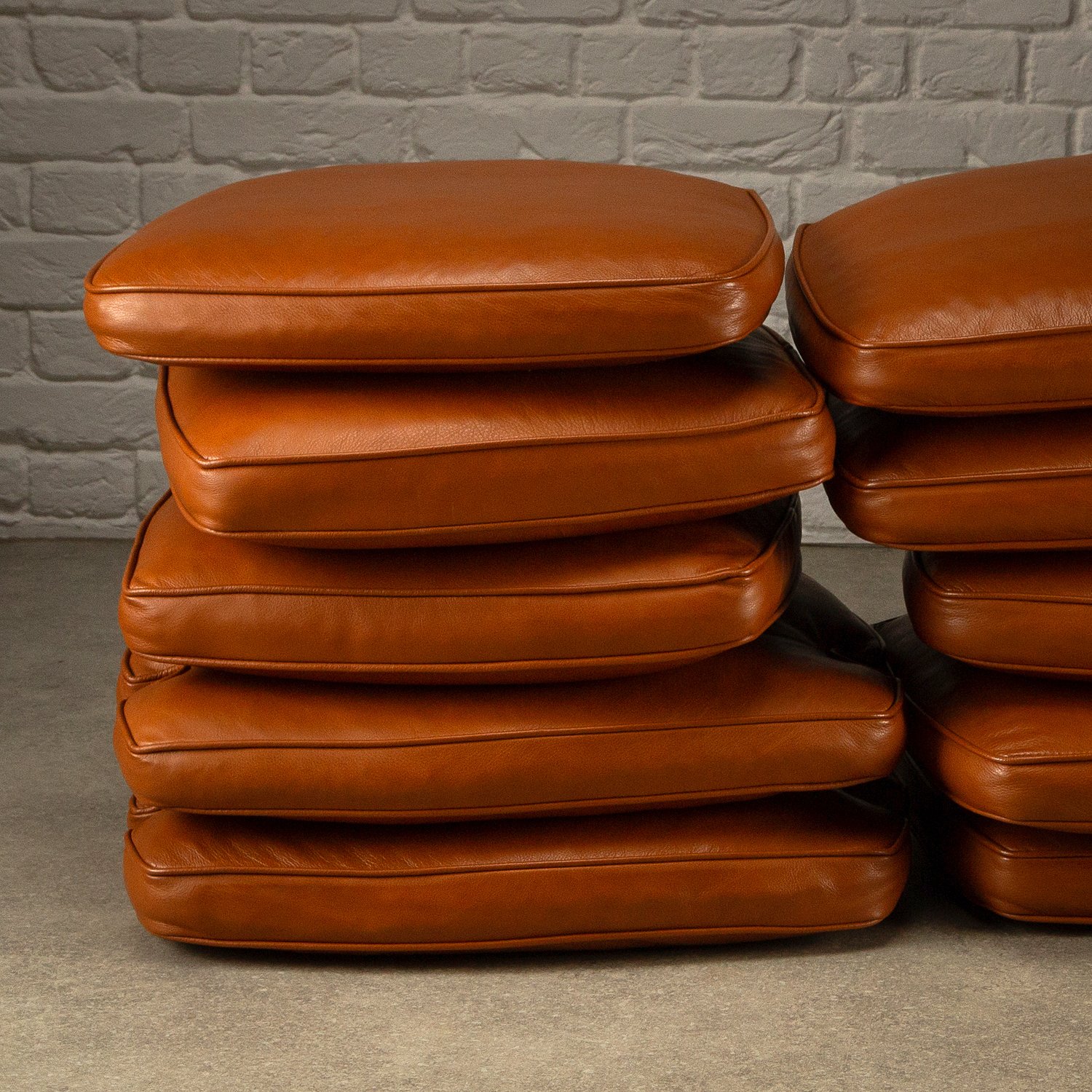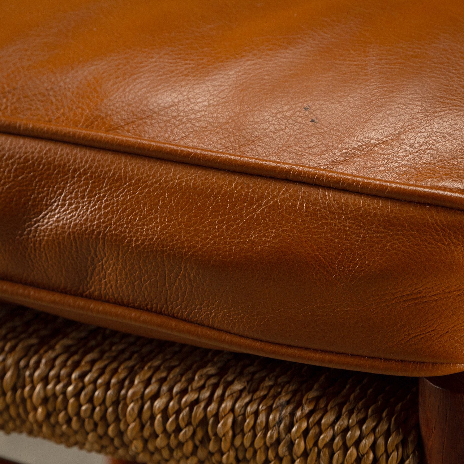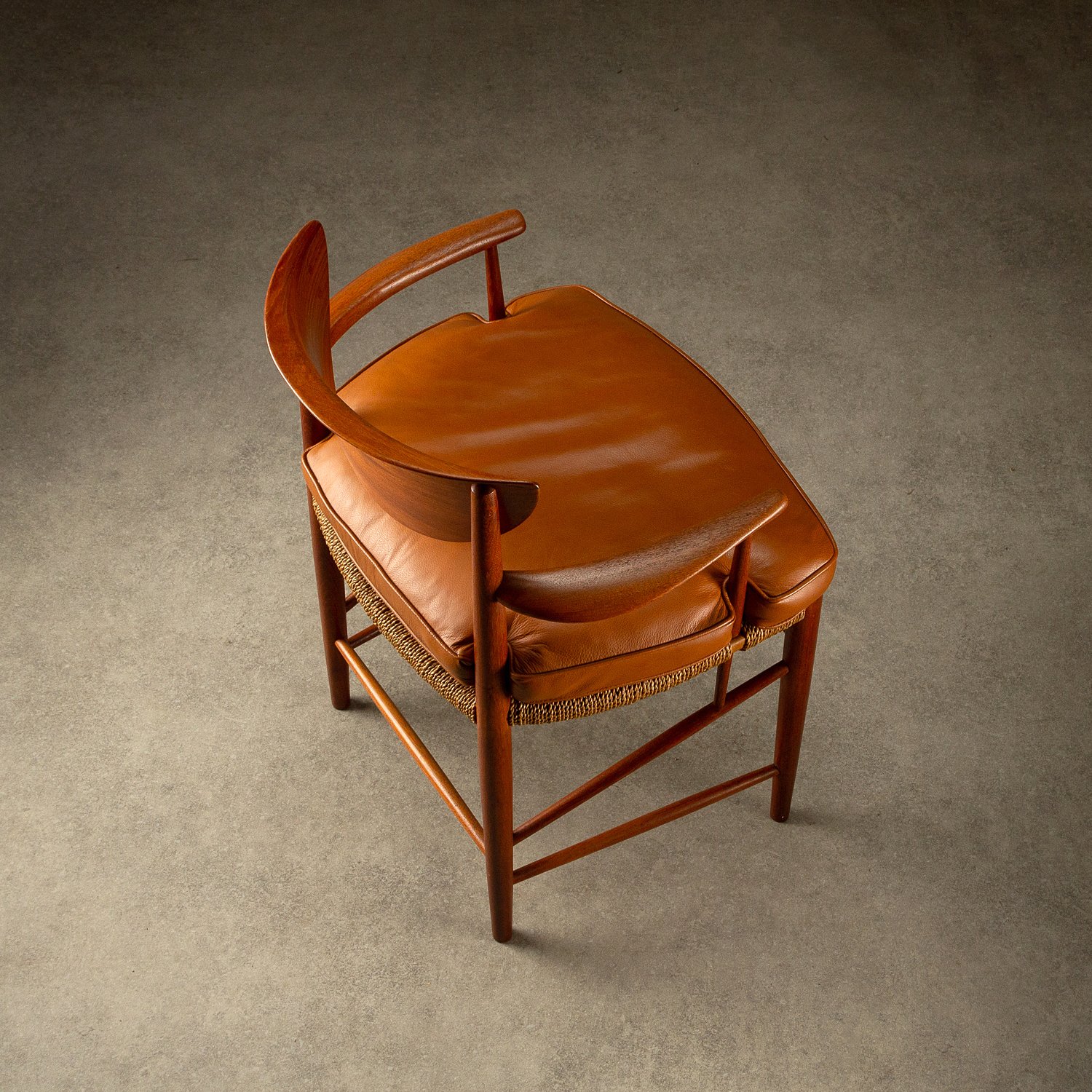 A set of ten dining chairs designed by Peter Hvidt and Orla Mølgaard-Nielsen for Søborg Møbelfabrik, Denmark, 1950s. Comprising of two Model 317 armchairs, six Model 316 chairs and two stools. Solid teak frames with seagrass seats. Includes bespoke-made cushions in cognac aniline leather. All original with lovely patina and signs of age. Professional repair to the back of one chair. See photographs.