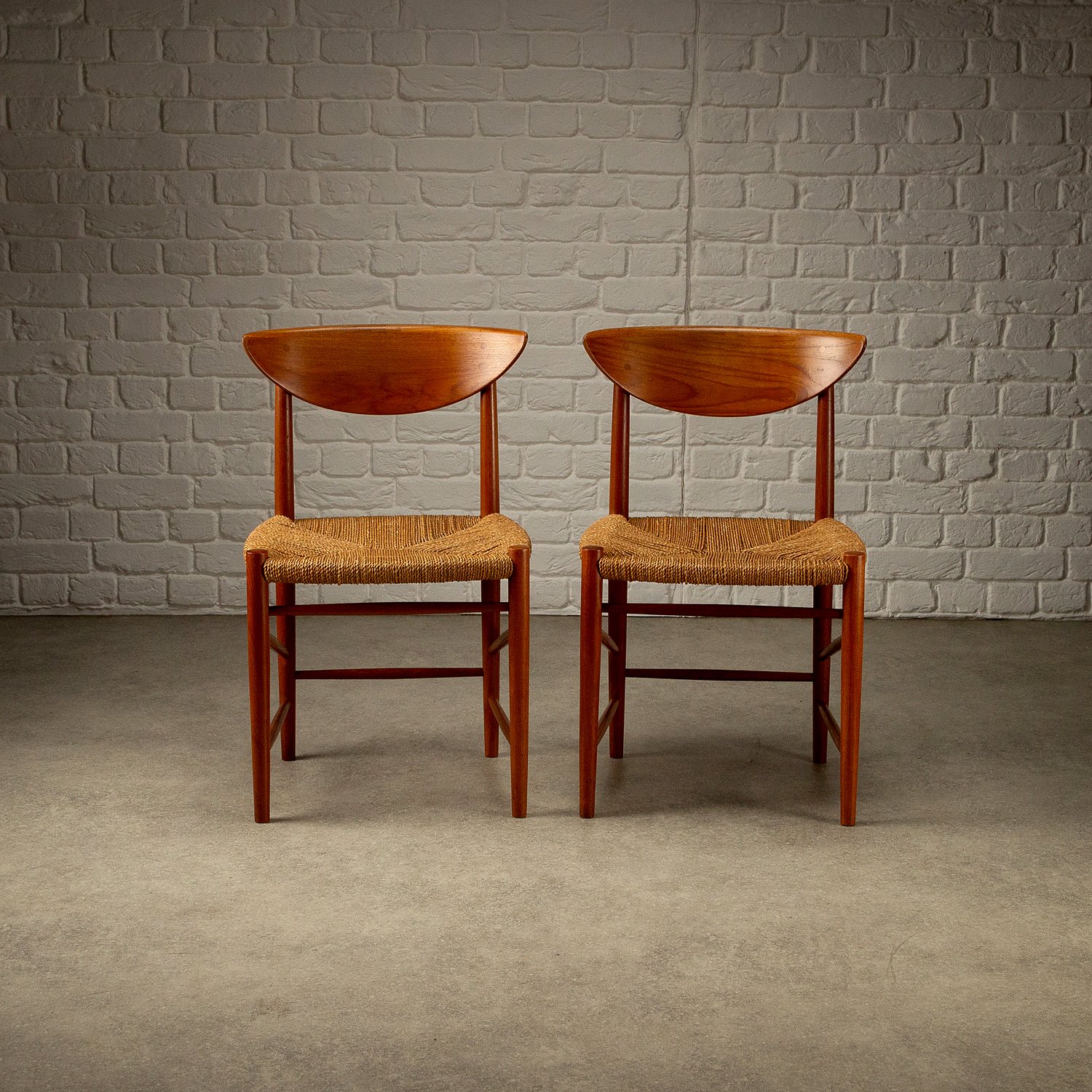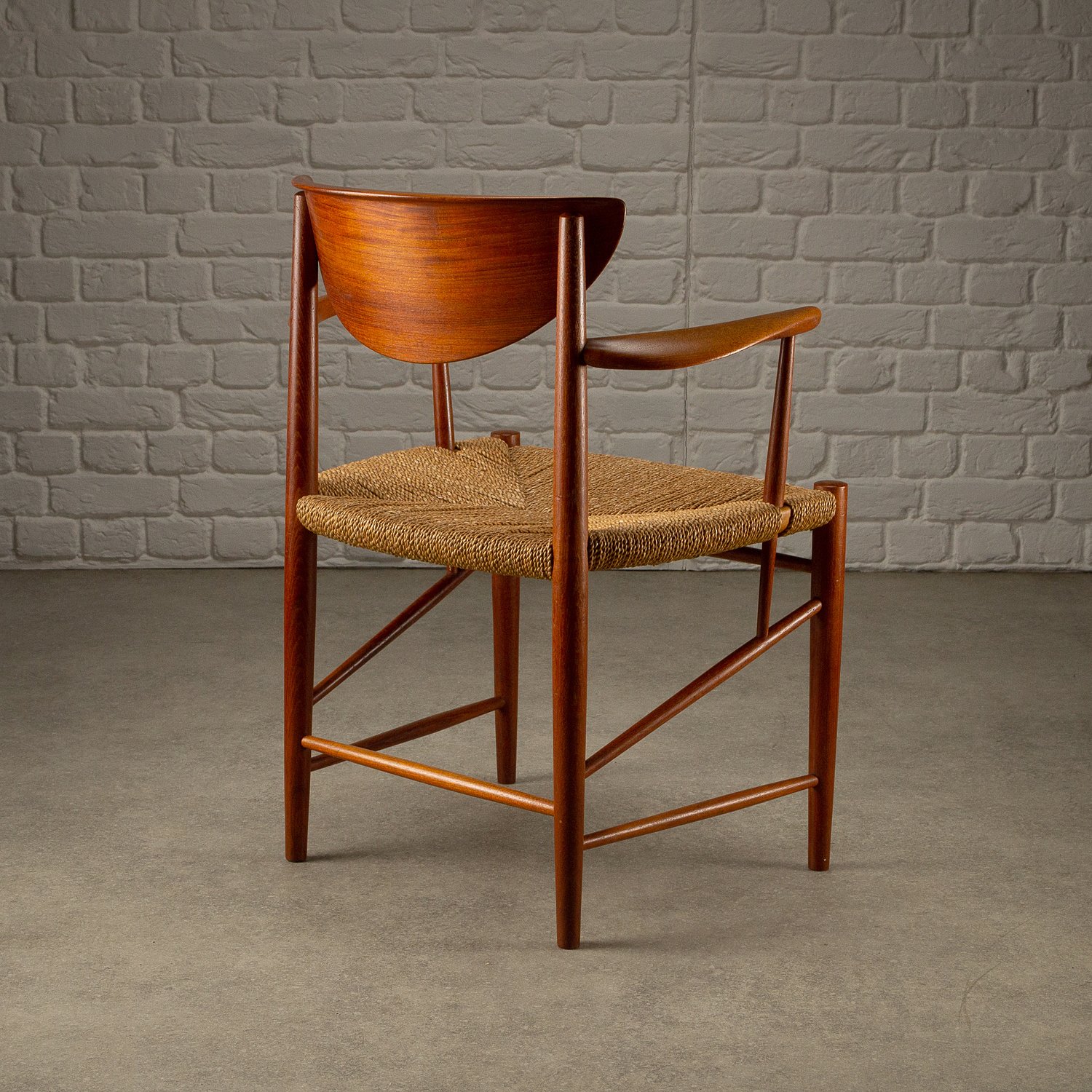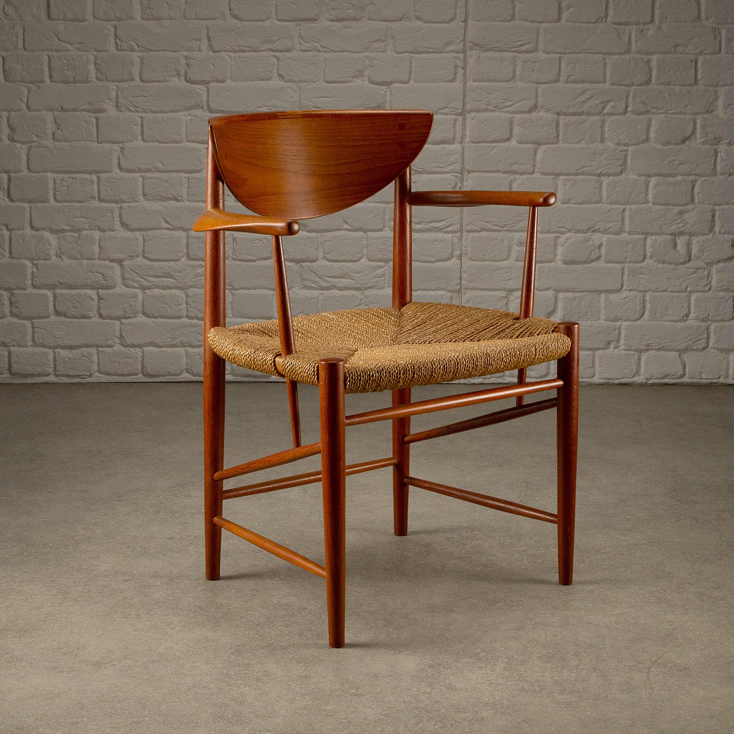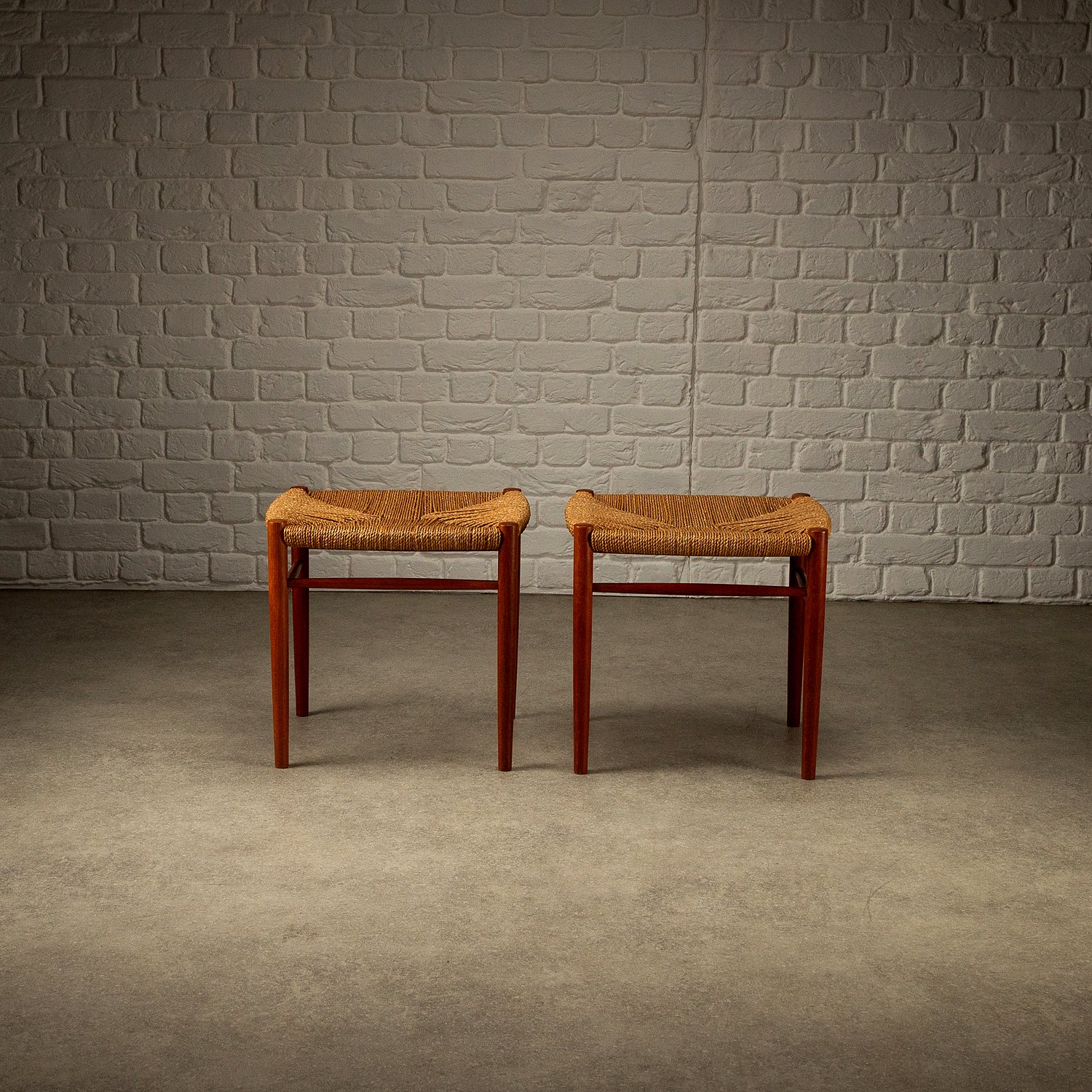 A set of ten dining chairs designed by Peter Hvidt and Orla Mølgaard-Nielsen for Søborg Møbelfabrik, Denmark, 1950s. Comprising of two Model 317 armchairs, six Model 316 chairs and two stools. Solid teak frames with seagrass seats. Includes bespoke-made cushions in cognac aniline leather. All original with lovely patina and signs of age. Professional repair to the back of one chair. See photographs.
