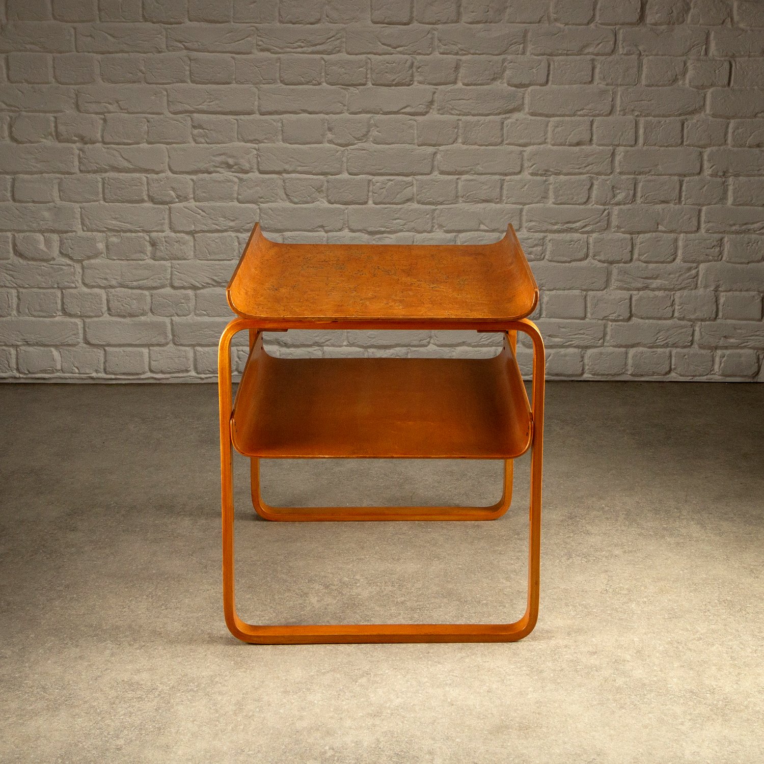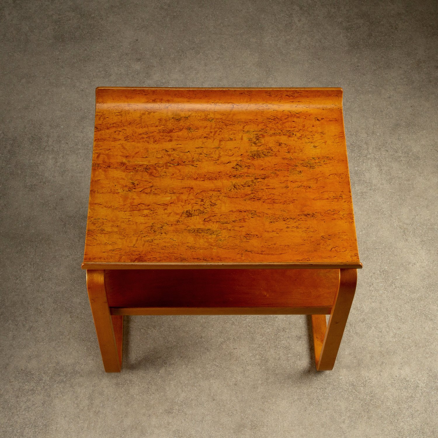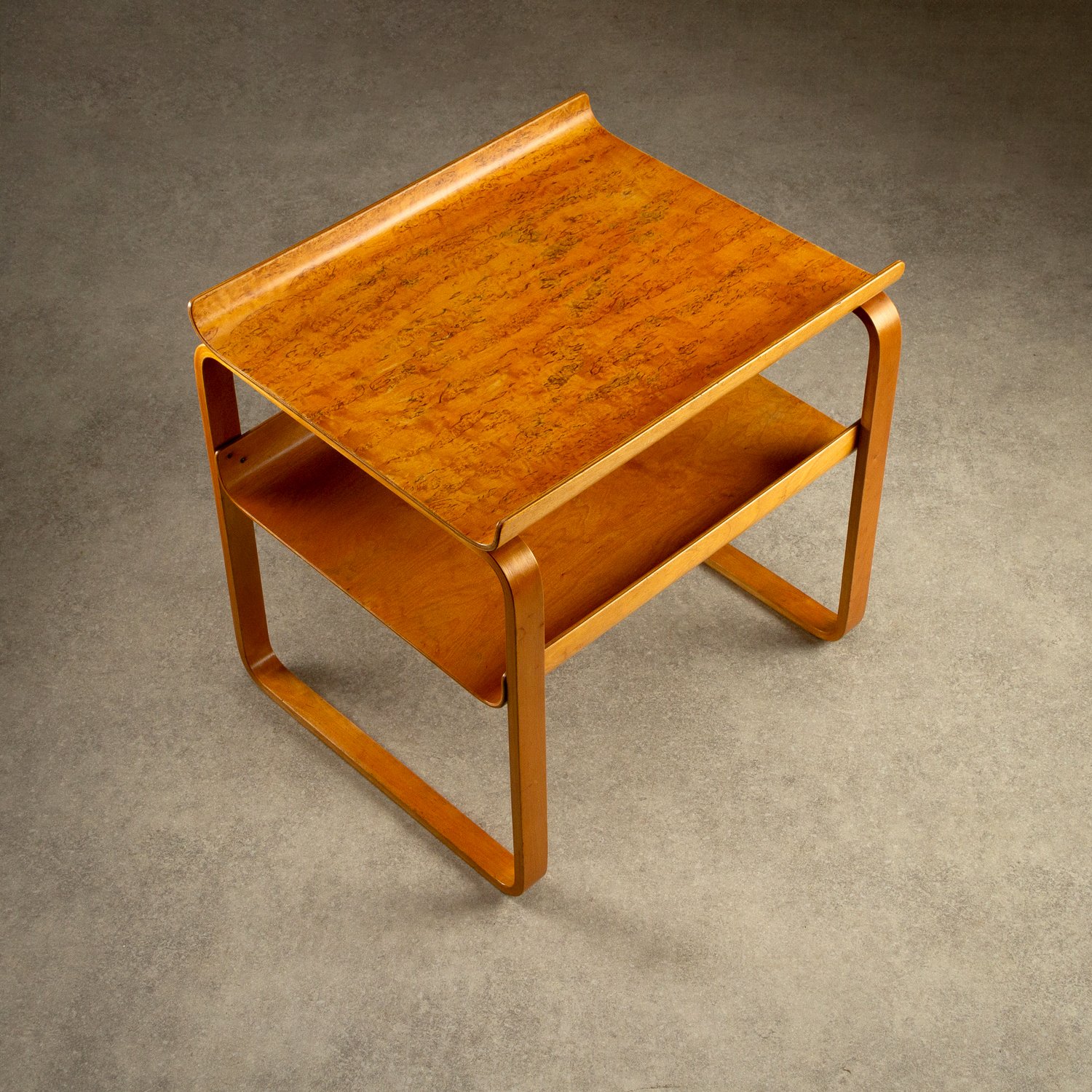 Two tier Model 915 side table in Karelian Birch. Designed by Alvar Aalto for Huonekalu-ja Rakennustyötehdas Oy Turku, Finland, 1930s. Imported by Finmar. Stamped underneath with the Alvar Aalto logo, the Finmar logo which was designed by Herbert Bayer and also the Finmar badge. Excellent vintage condition. This piece was originally bought by Bristol architect Ralph Brentnall in the 1930s from prominent Bristol-based furniture manufacturer and retailer, PE Gane. Provenance: family collection.