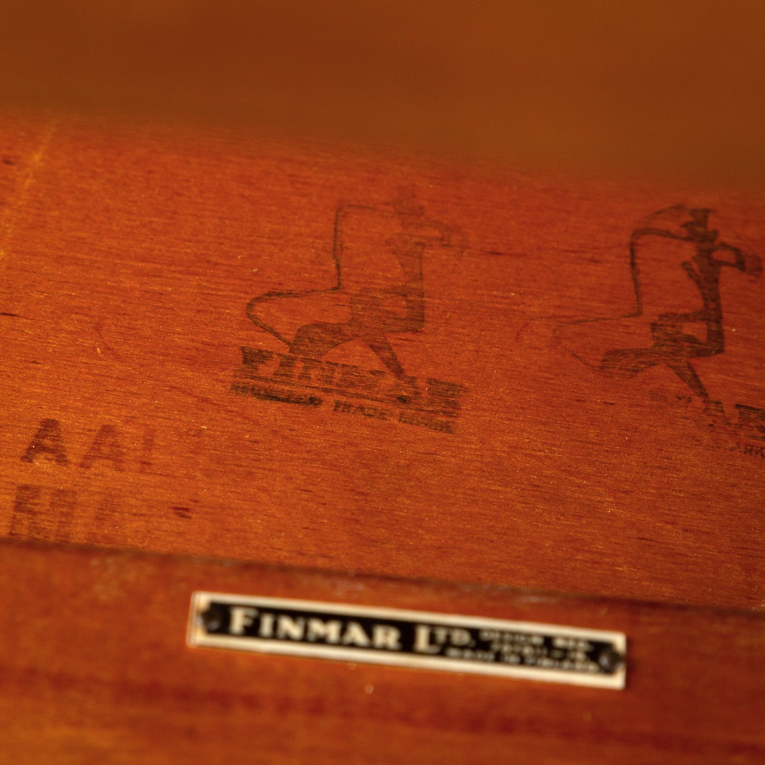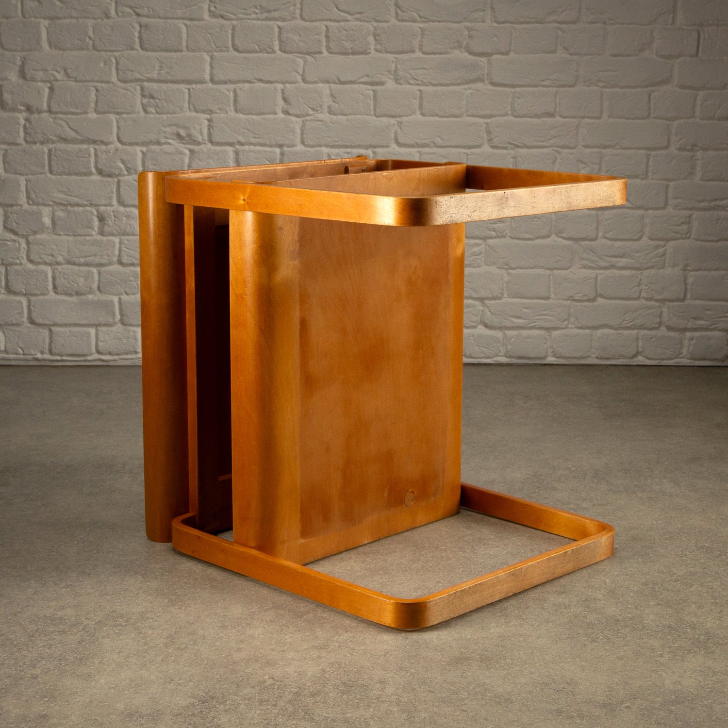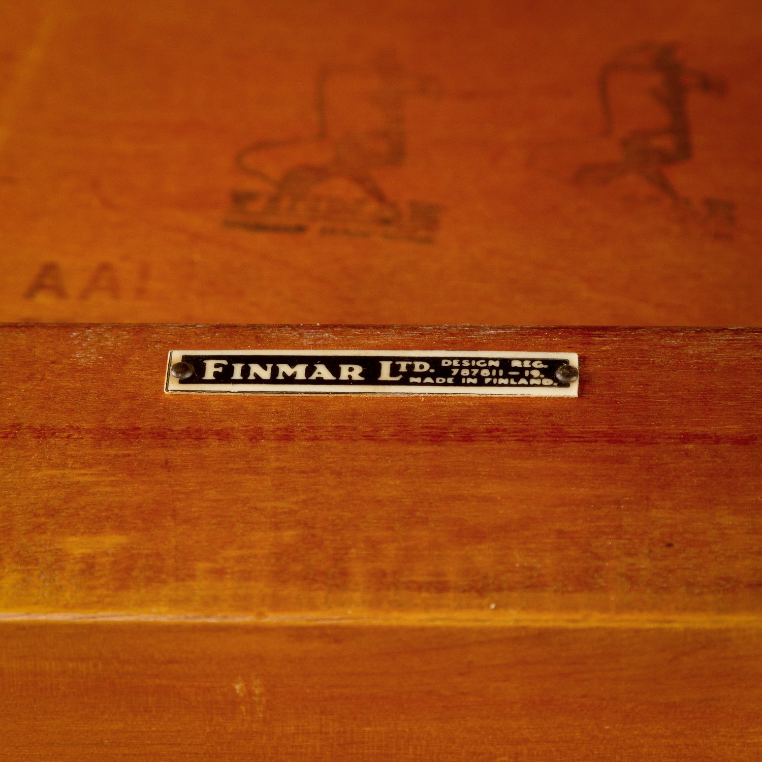 Two tier Model 915 side table in Karelian Birch. Designed by Alvar Aalto for Huonekalu-ja Rakennustyötehdas Oy Turku, Finland, 1930s. Imported by Finmar. Stamped underneath with the Alvar Aalto logo, the Finmar logo which was designed by Herbert Bayer and also the Finmar badge. Excellent vintage condition. This piece was originally bought by Bristol architect Ralph Brentnall in the 1930s from prominent Bristol-based furniture manufacturer and retailer, PE Gane. Provenance: family collection.